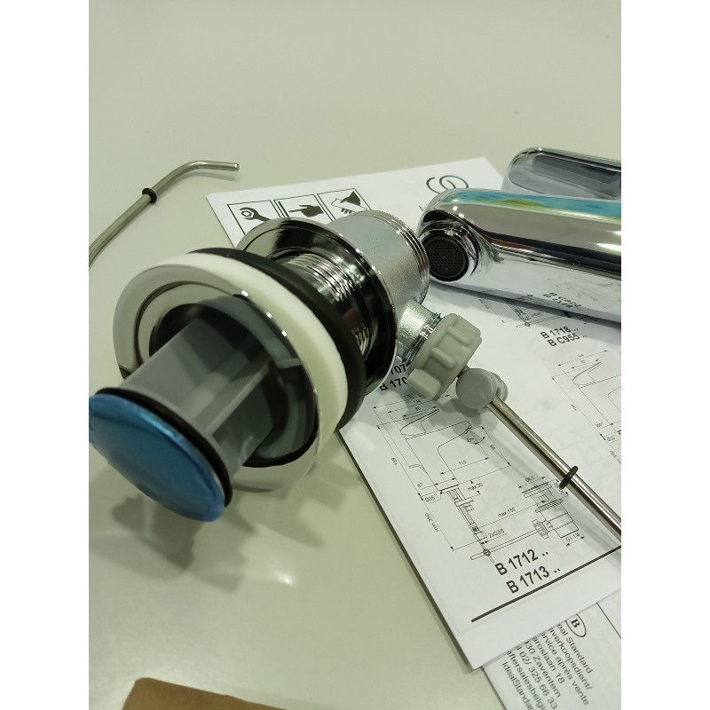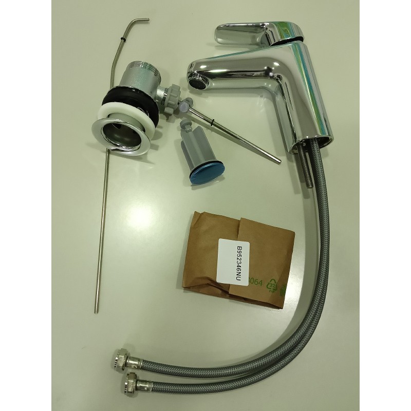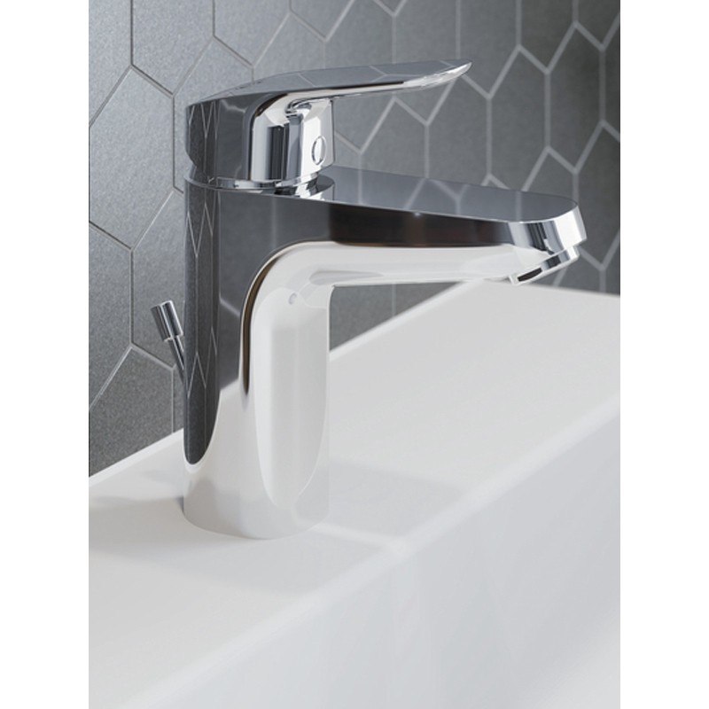 Miscelatore monocomando lavabo con bocca di erogazione fissa. aeratore slim con portata massima 5 l/m. Dotato di cartuccia da 38 mm con limitatore della temperatura. Sistema di fissaggio EasyFix. Tubi flessibili con attacco G3/8”. Con asta di comando e scarico piletta da 1-1/4”.